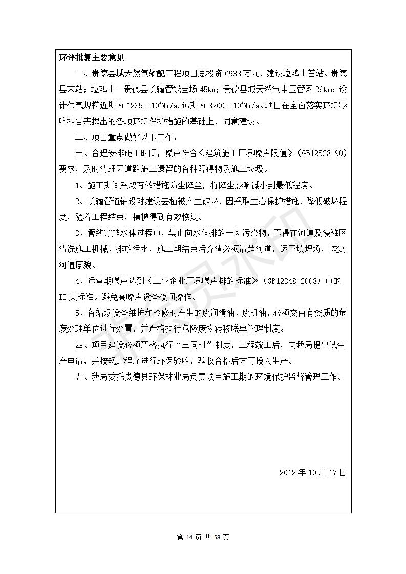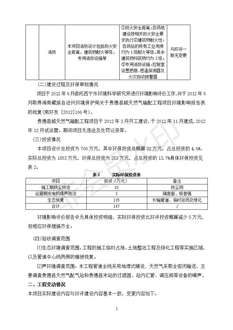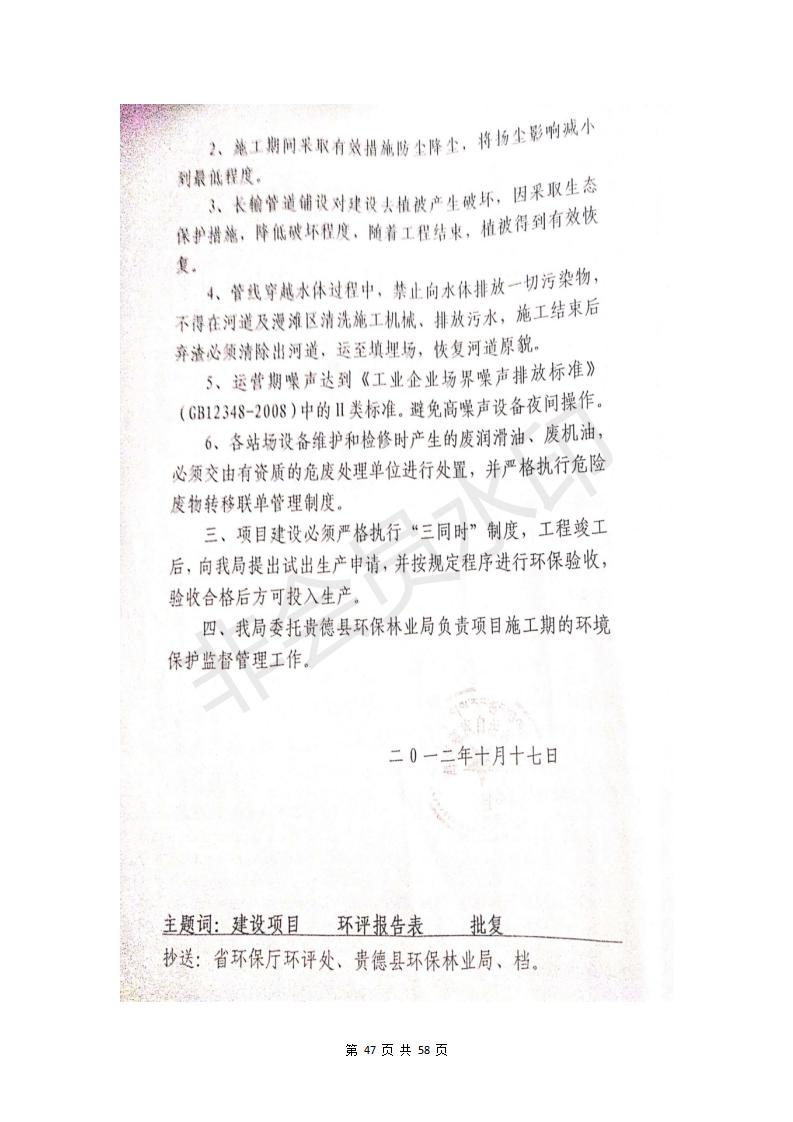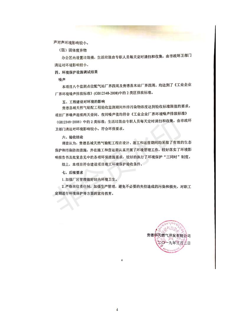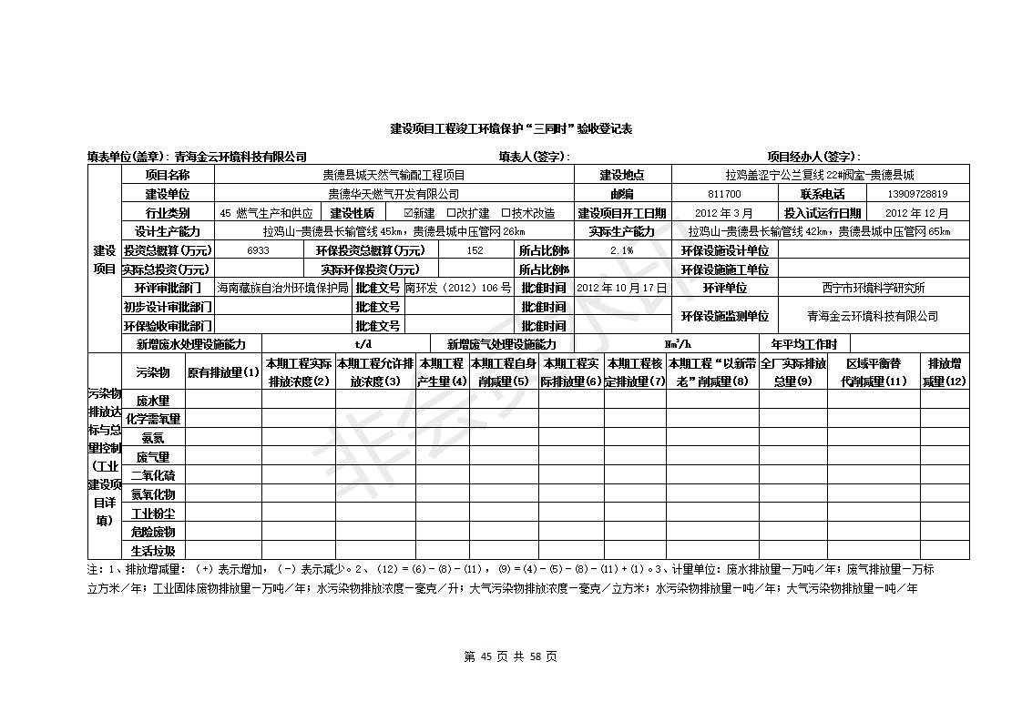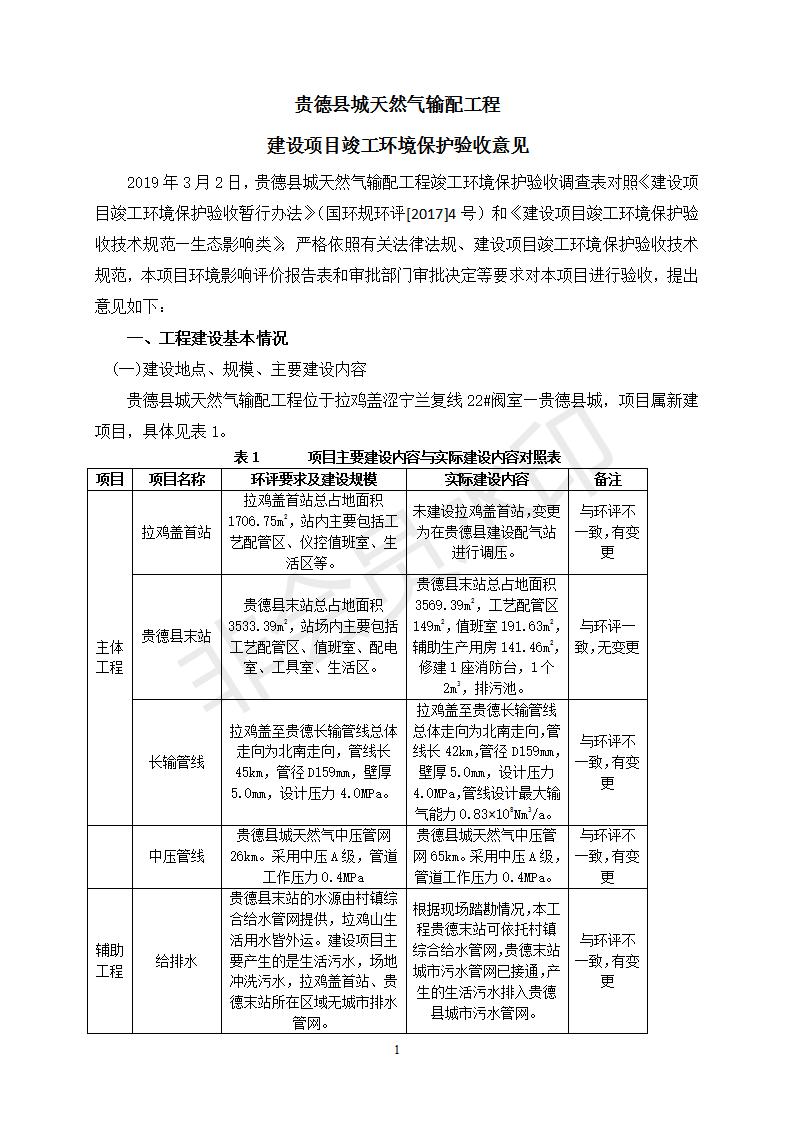 根據(jù)中華人民共和國務(wù)院令第682號(hào)《國務(wù)院關(guān)于修改〈建設(shè)項(xiàng)目環(huán)境保護(hù)管理?xiàng)l例〉的決定》和《建設(shè)項(xiàng)目竣工環(huán)境保護(hù)驗(yàn)收暫行辦法》(國務(wù)院令682號(hào)),貴德縣城輸配管線工程竣工環(huán)境保護(hù)驗(yàn)收內(nèi)容(包括竣工環(huán)境保護(hù)驗(yàn)收調(diào)查表和驗(yàn)收意見)公示如下